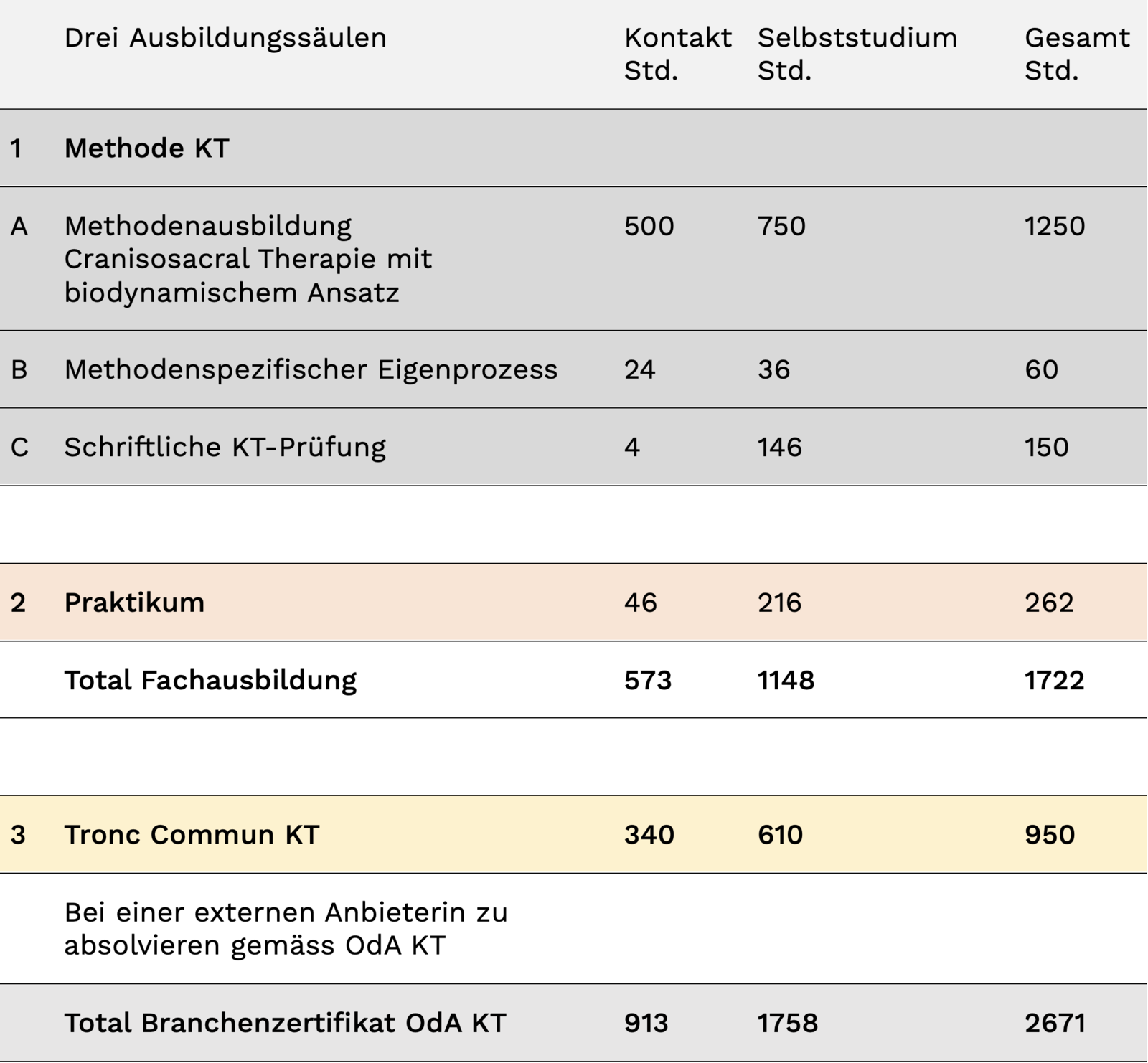 Der Lehrgang entspricht den Grundlagen der KomplementärTherapie gemäss Organisation der Arbeit KomplementärTherapie (OdA KT) und der Methodenidentifikation (METID) Craniosacral Therapie. Die Ausbildung orientiert sich am Berufsbild der KomplementärTherapie (KT) und lehrt komplementärtherapeutisches Handeln: methodenzentriert, körperzentriert, prozesszentriert und interaktiv.